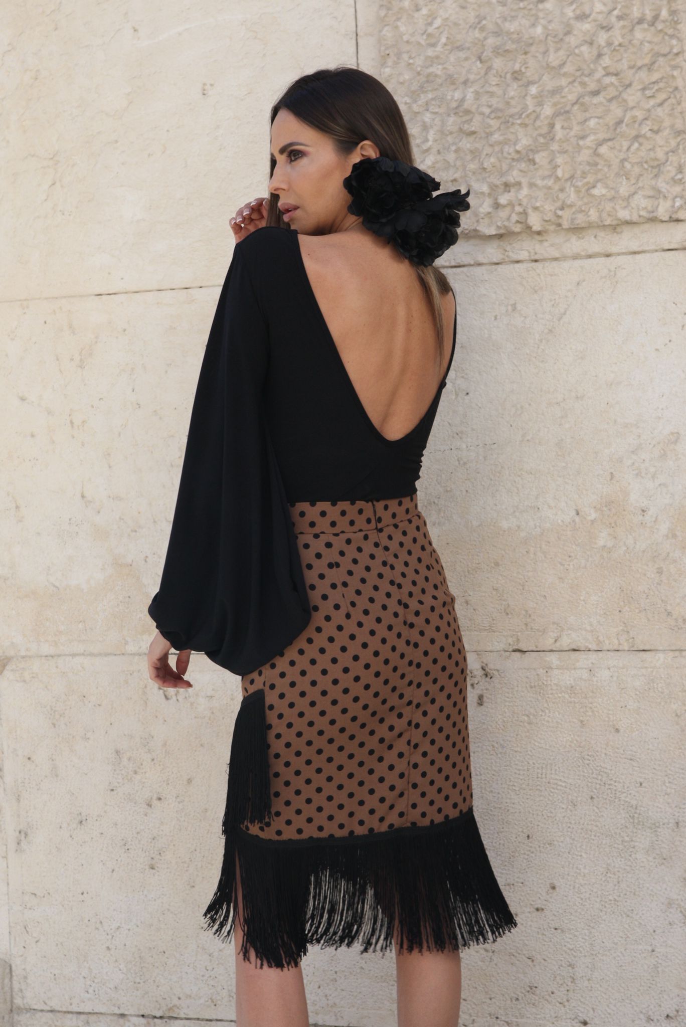 bonita falda de lunares con fleco elegante y estilosa. Largo midi.